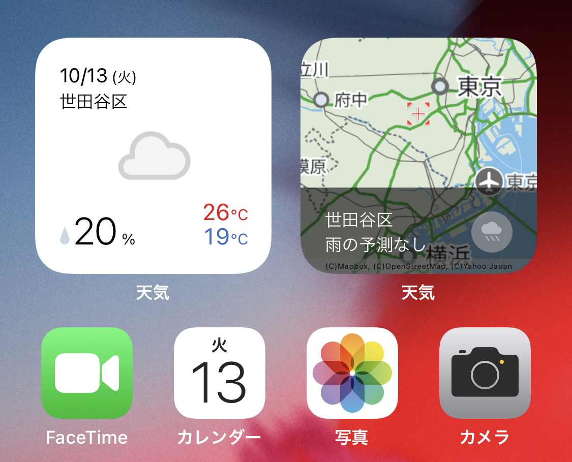 これで「Yahoo!天気」のウィジェットがホーム画面に追加されました。前の手順で「天気予報」を選択したため、登録地点の天気。降水確率と気温もわかります。ウィジェットはホーム画面に複数表示できるので、「雨雲レーダー」などと一緒に並べてもいいでしょう。