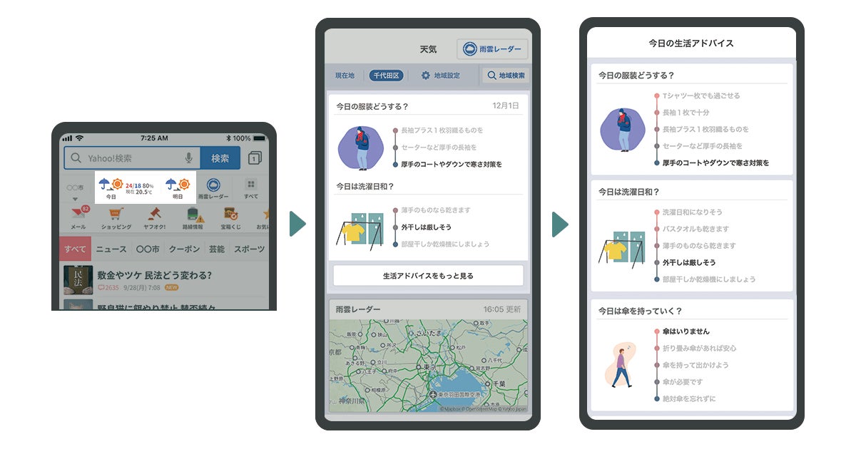 ヤフー株式会社(以下、Yahoo! JAPAN)が提供する「Yahoo! JAPAN」アプリ(iOS版、Android版)は、天気ページにて「コートが必要か」「洗濯物は外干しできるか」「傘を持って行くべきか」など、ユーザーの一日の行動をサポートする「生活アドバイス情報」(以下、本機能)の提供を開始しました。