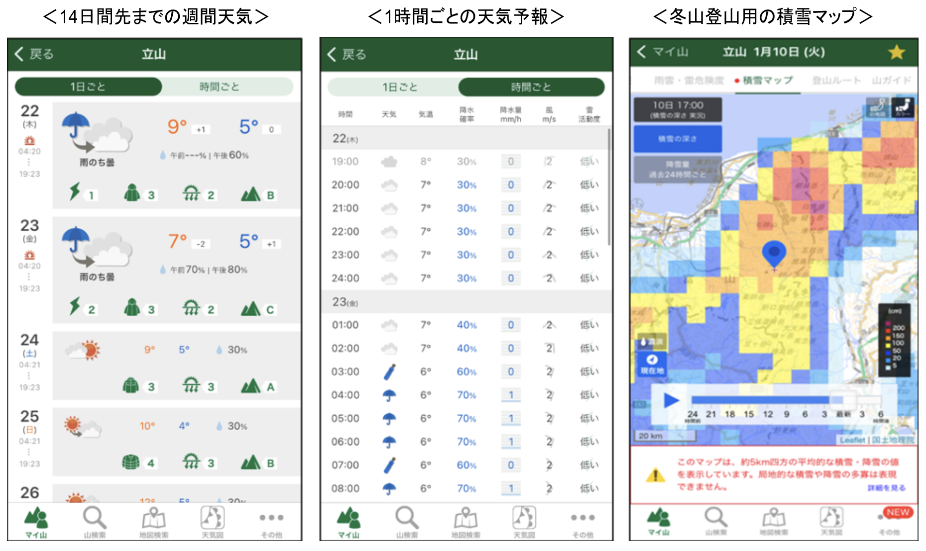 本アプリでは、登山者が山を登る前にいくつかの山と天気を比較して、どの山に登るか大枠の計画を立てるために使うケースが多いことが考えられます。プレミアムプランの新機能では、2週間先の天気予報も確認できるようになり、より広い視点で登山計画を練ることが可能となります。他にも、1時間ごとの天気予報や積雪マップの活用といったプレミアムプラン限定の機能で、変わりやすい山の天気に適した情報を収集でき、充実した”山ライフ”に役立てていただくことが可能です。